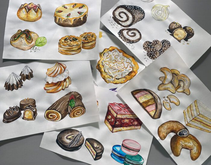 Vízfestékkel készült festmények, természetes formák és sütemények inspirációjával, ahol a színek tesznek minden alkotást egyedivé.