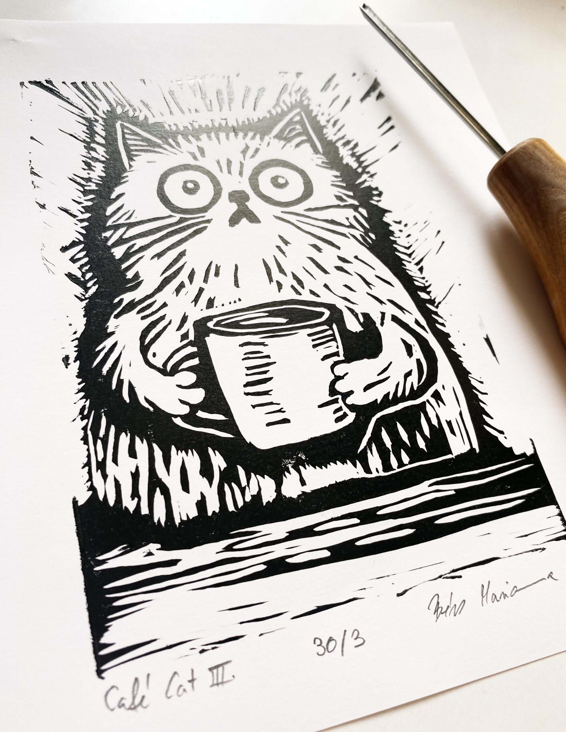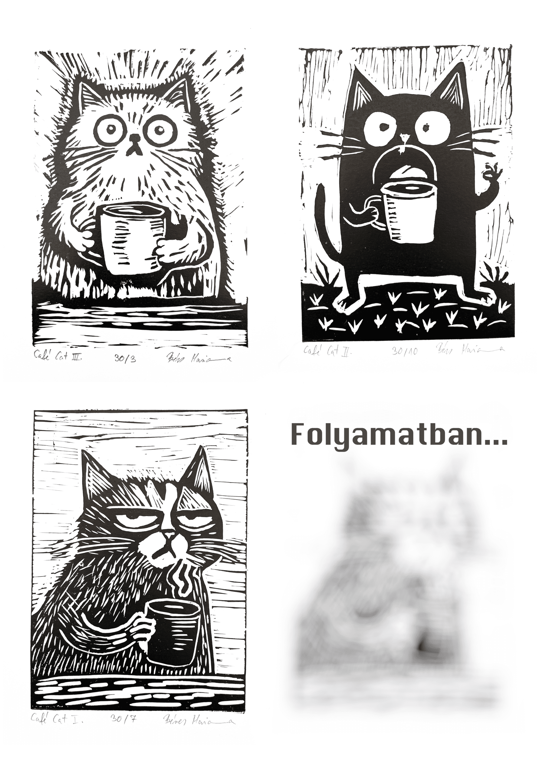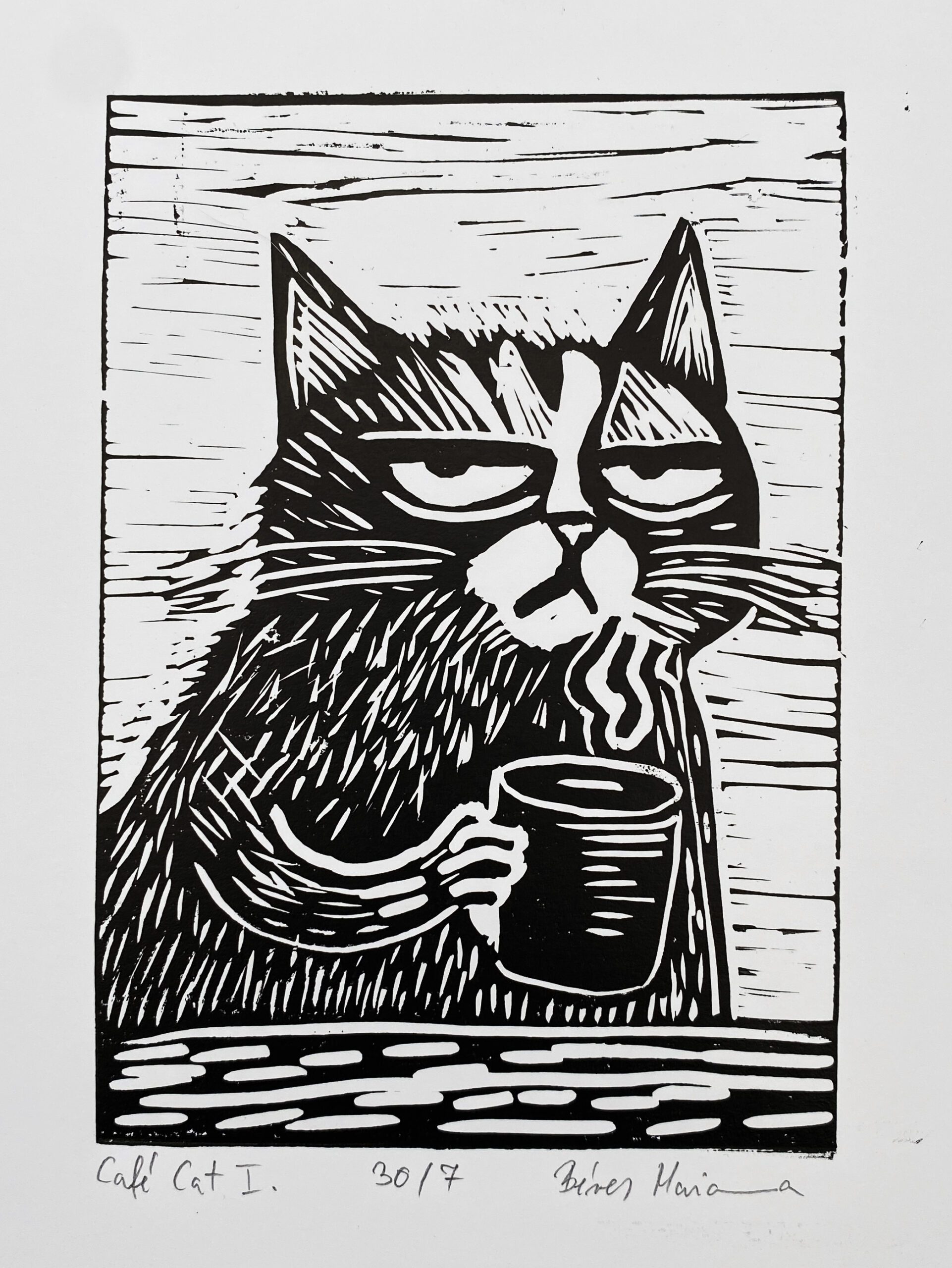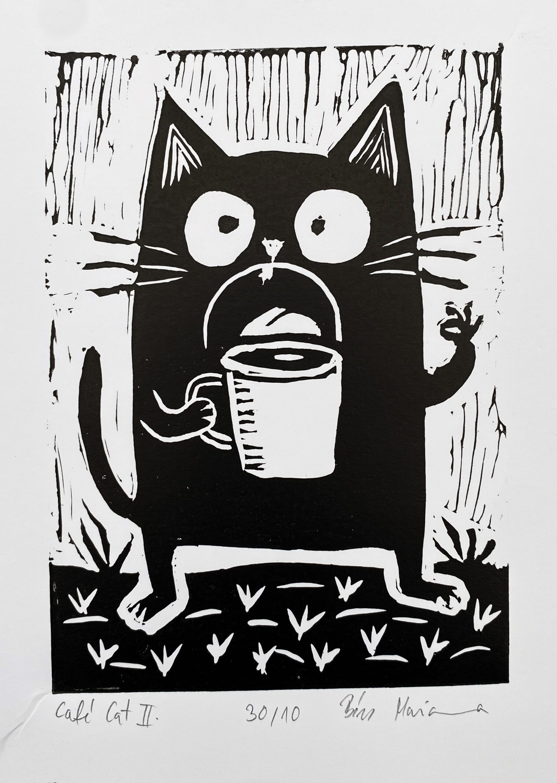 A/6-os méretben készült, macskás–kávés témájú, vidám hangulatú egyszínnyomásos linóleummetszet.