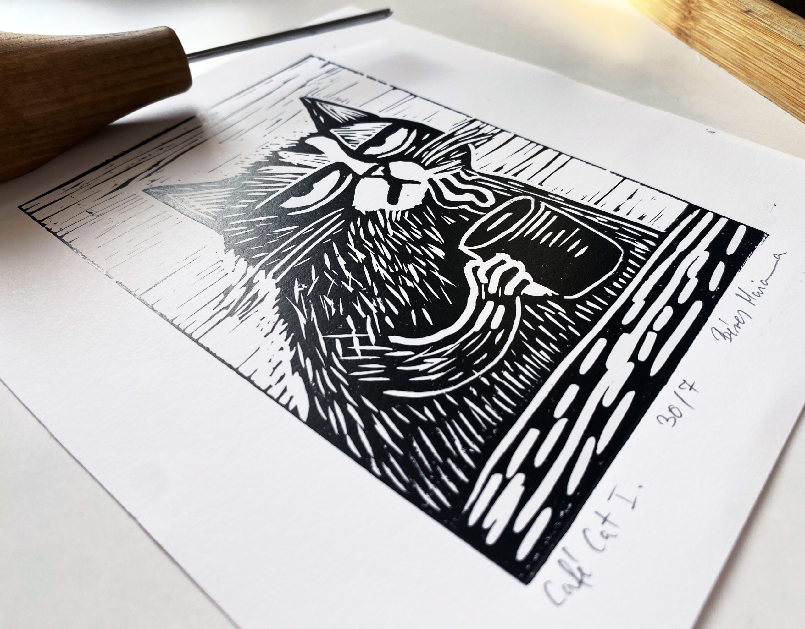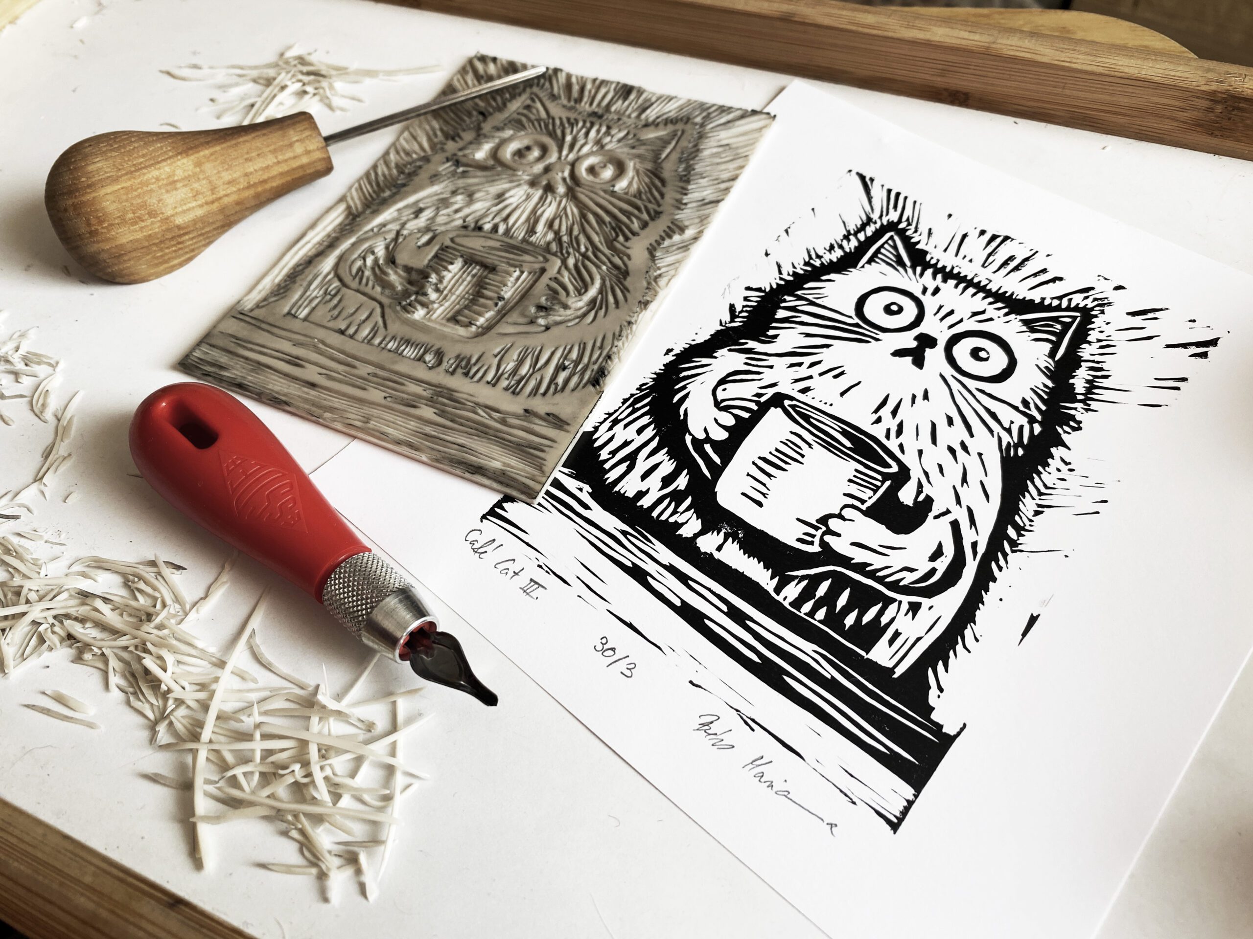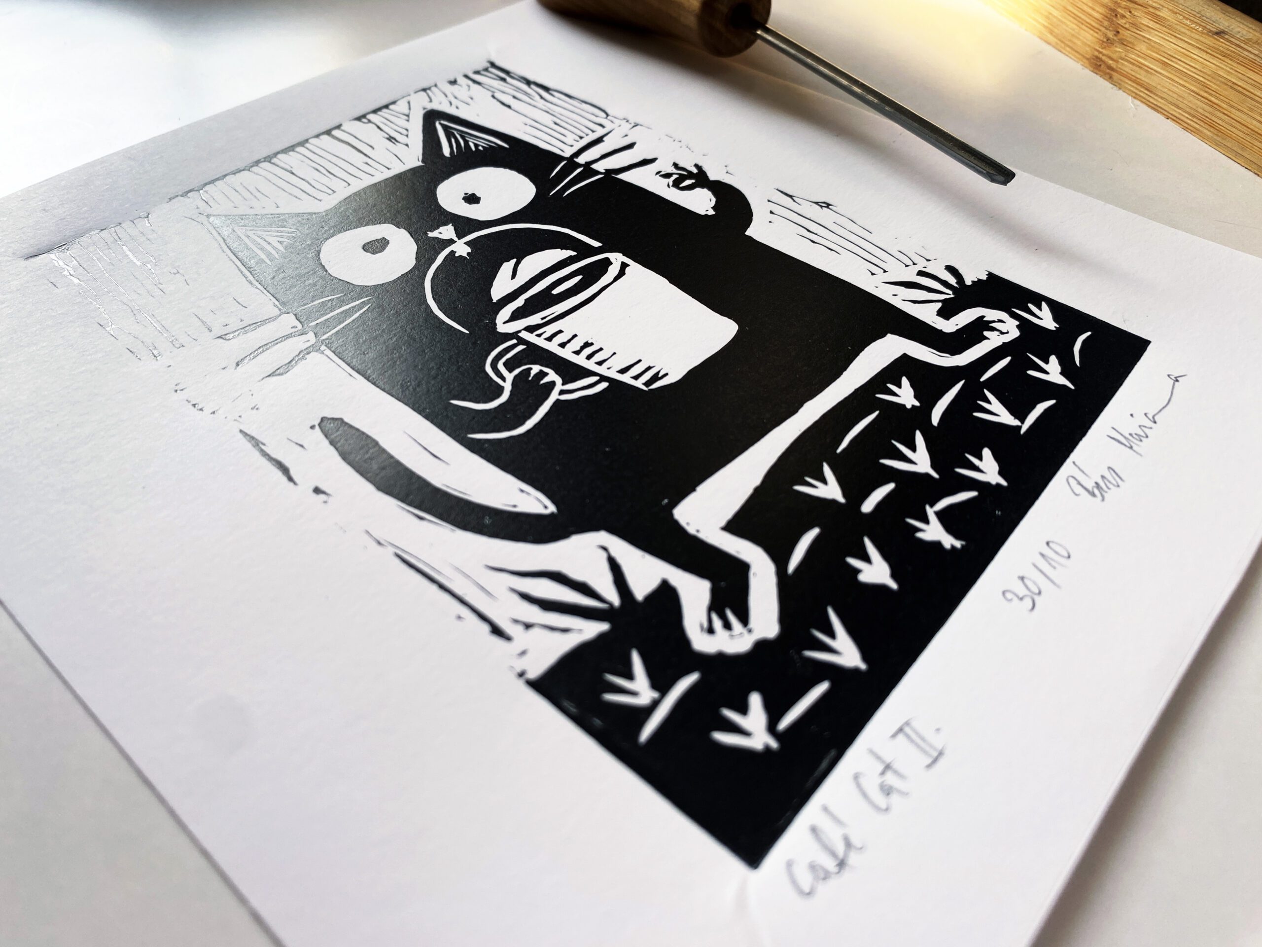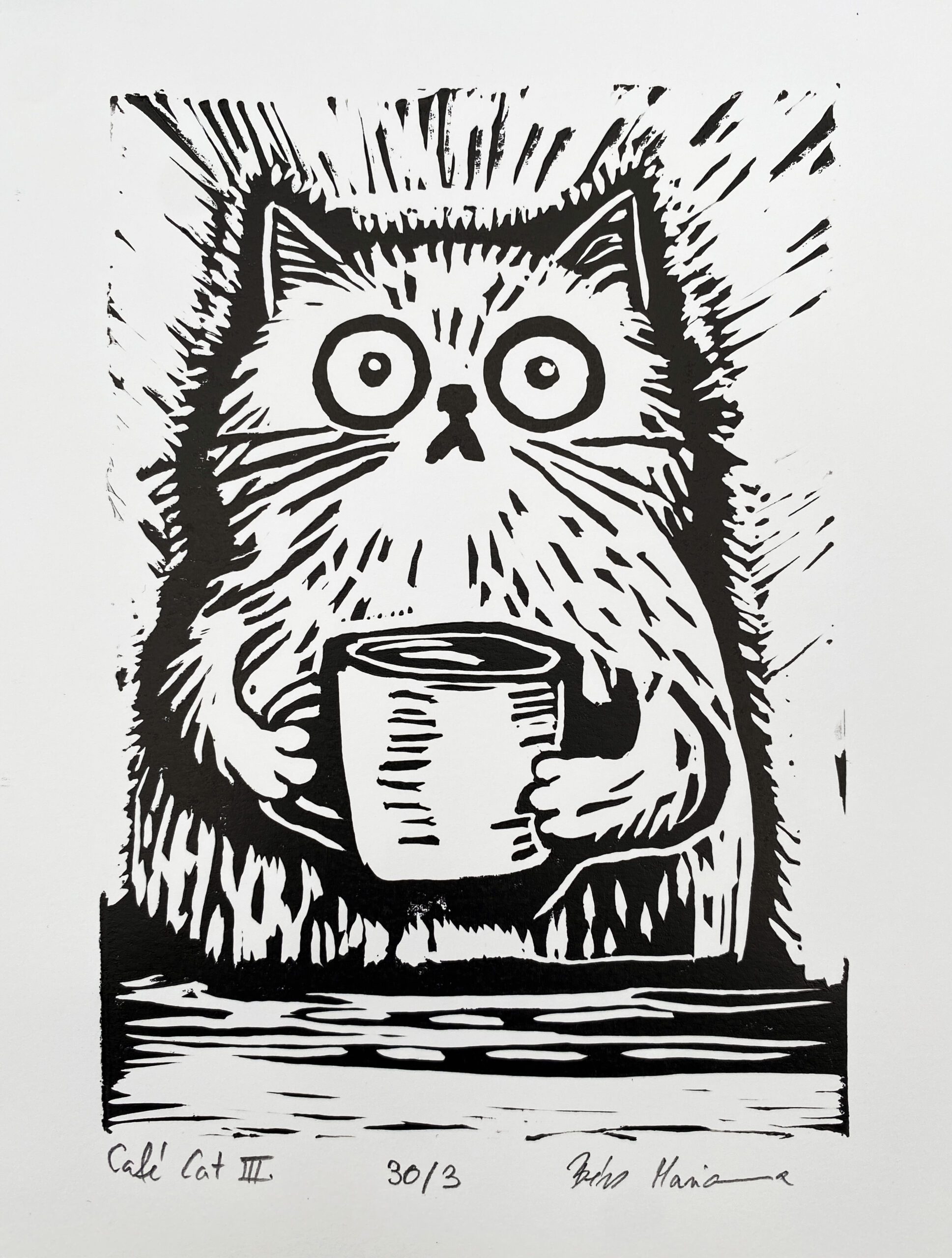 A/6-os méretben készült, macskás–kávés témájú, vidám hangulatú egyszínnyomásos linóleummetszet.