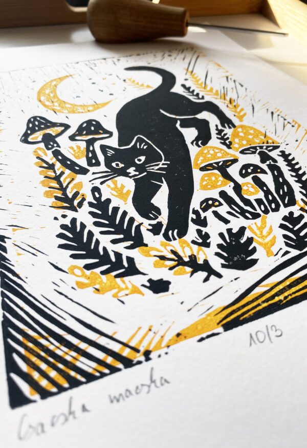 Kétszínnyomásos, macskás témájú, vidám hangulatú linóleummetszet.